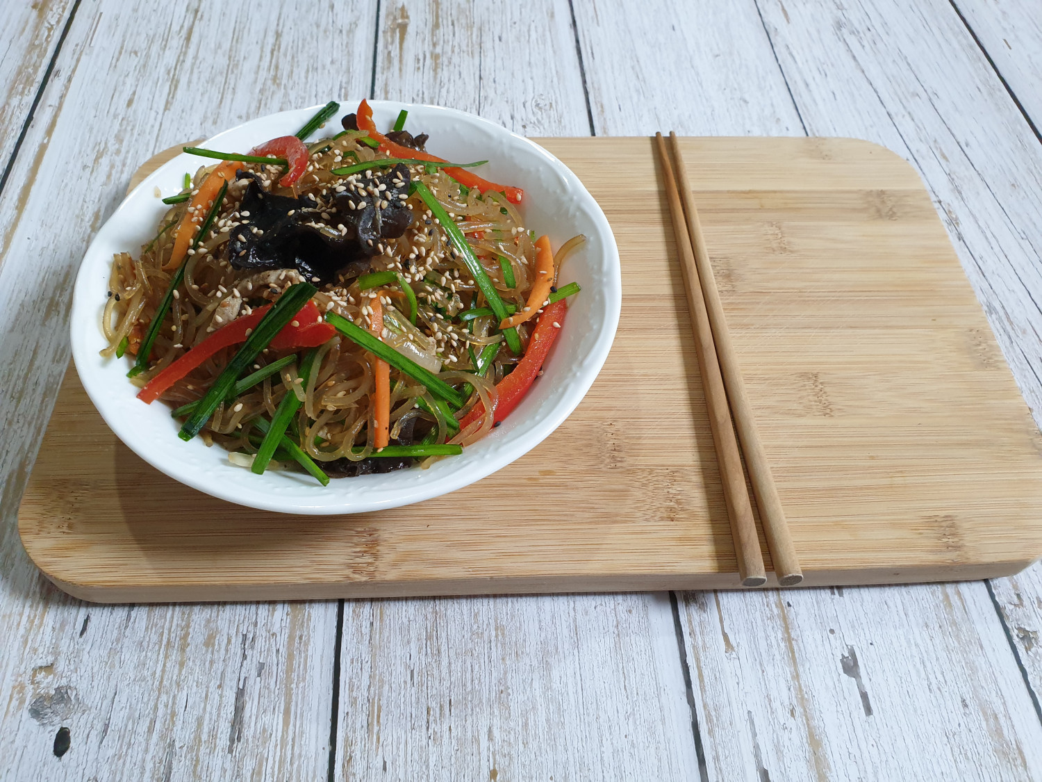 In a large bowl, combine the cooled, cooked glass noodles with all the stir-fried ingredients. Add the Korean chives and a drizzle of sesame oil.