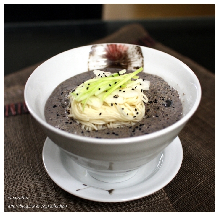 Your delicious Black Soybean Noodles are ready to be served! Place the chewy noodles into a serving bowl. Garnish with thinly sliced cucumber or Korean melon (or cantaloupe). Finally, pour the chilled, creamy black soybean broth over the noodles and add a few ice cubes for an extra refreshing touch. Enjoy your healthy and satisfying summer meal!
