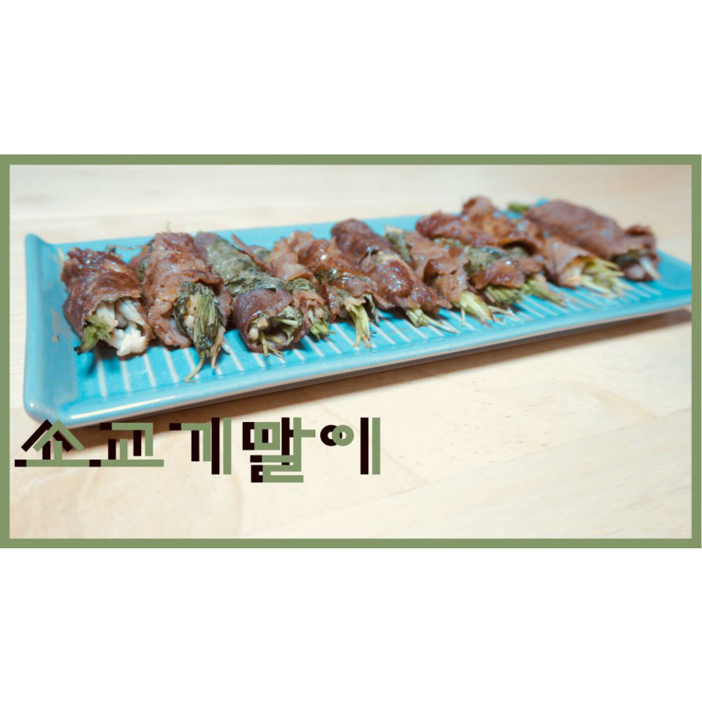 First, gently pat the beef slices with paper towels to remove excess blood. Wash the chives and cut them into lengths of about 5-7 cm. Trim the base of the king oyster mushrooms and rinse them lightly under running water. Wash the perilla leaves, pat them dry, and then cut each leaf in half horizontally for easier placement on the beef.