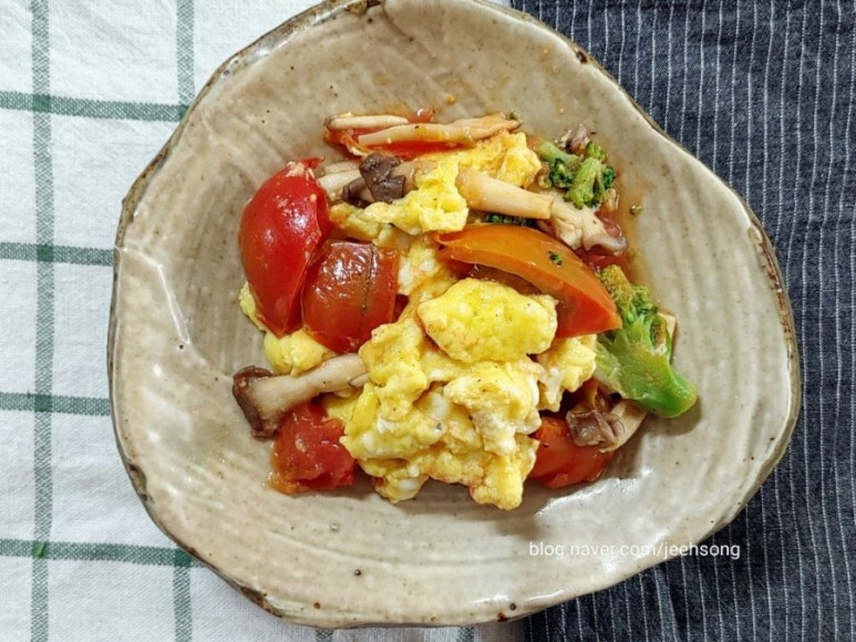 Push the scrambled eggs to one side of the pan, or use a clean pan. Add a little more olive oil and stir-fry the sliced tomatoes, prepared vegetables, and mushrooms over medium heat. Avoid overcooking the tomatoes to maintain their slight crispness and fresh flavor.