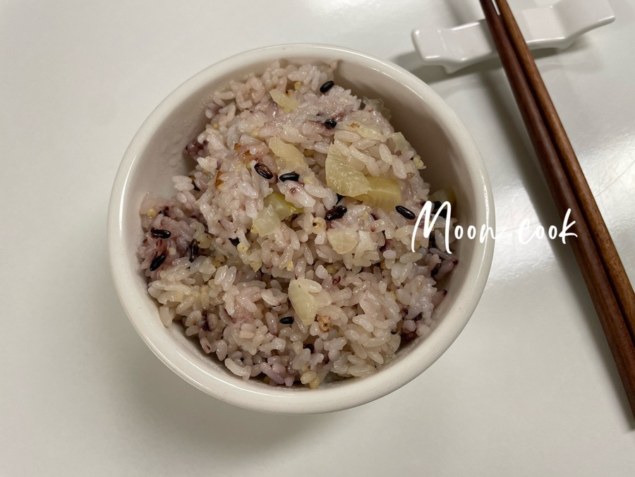 Add 3 cups of rice and a small amount of mixed grains to your rice cooker. For the water, fill it to just below your index finger’s first knuckle. This ensures the rice isn’t too soggy from the moisture released by the radish during cooking.