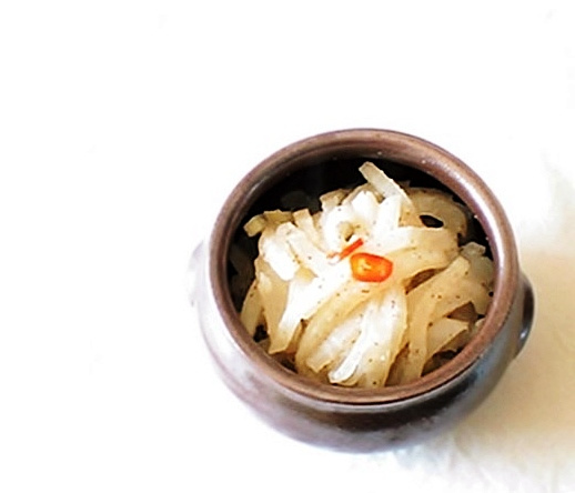 This radish namul is made with the addition of perilla seed powder, which makes it even more delicious when chilled. It’s a nutty and nutritious dish.