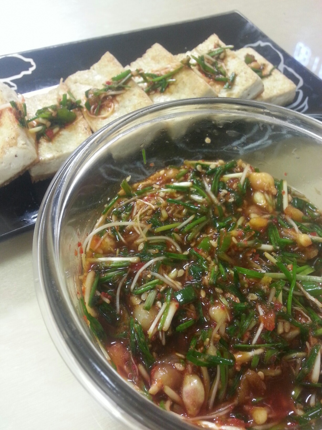 Here’s a delightful dish of pan-fried tofu served with a wonderfully fragrant wild chives sauce. This sauce is a ‘rice thief’ – perfect for mixing into rice when you lack appetite, or fantastic when wrapped in crispy roasted seaweed. It’s a simple yet incredibly satisfying meal!