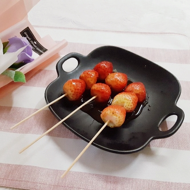 Heat the sugar and water mixture over medium heat. Once it starts to boil and large bubbles form, reduce the heat to low. Carefully dip each strawberry skewer into the syrup, swirling gently to coat all sides evenly. You can use chopsticks to help rotate the skewer for a complete coating.