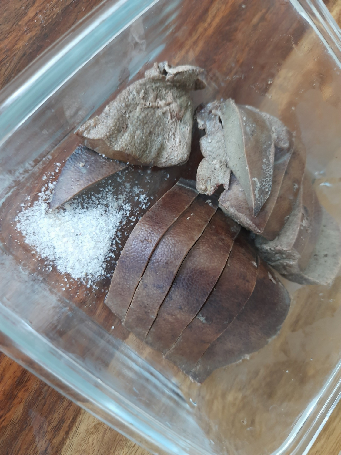 As the liver cooks through, you’ll notice it shrinks considerably. The darker, solidified substance on the sides is coagulated blood, which is a natural part of the cooking process and nothing to worry about.