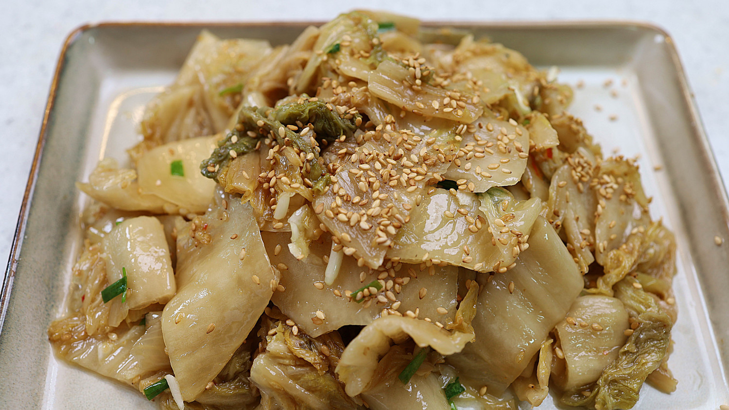 First, gently rinse the aged kimchi under running water to lightly wash off excess saltiness from the outer leaves. Be careful not to wash too vigorously, as this can diminish the kimchi’s flavor. Once rinsed, cut the kimchi into bite-sized pieces, about 2-3 cm. If your kimchi is particularly salty, be sure to squeeze out any excess water after rinsing.
