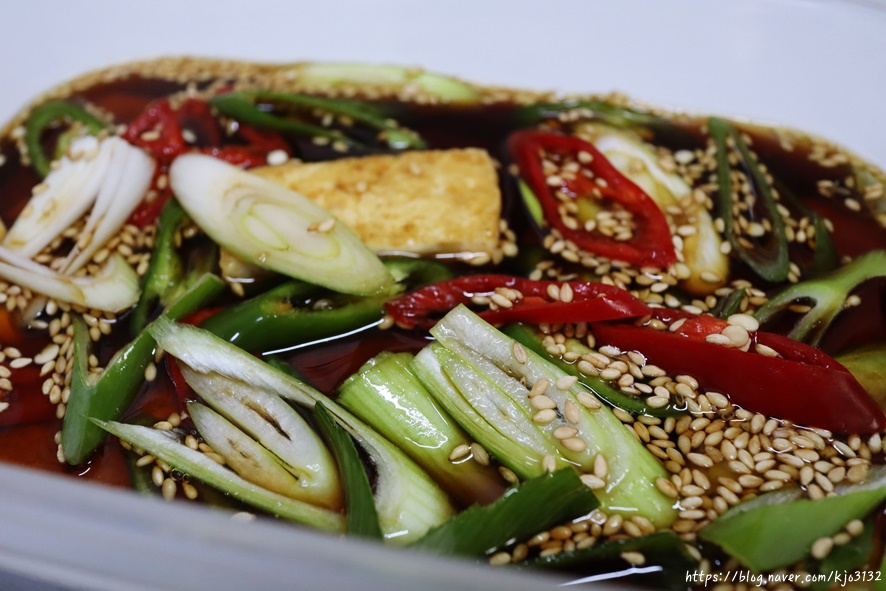 Sprinkle the finely sliced chili peppers and chopped green onion evenly over the tofu. Pour the completely cooled sauce mixture over everything. Finally, sprinkle with 1/2 tablespoon of toasted sesame seeds. Close the lid and refrigerate for at least half a day, or longer for a deeper flavor. Your delicious tofu jangajji is ready to be enjoyed!