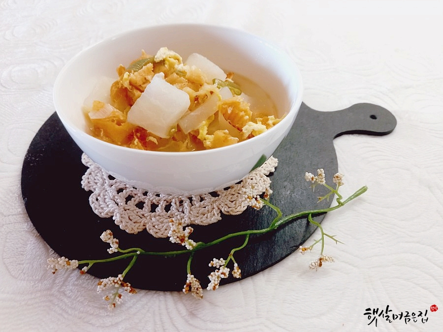 First, soak the dried pollack in cold water for about 5 minutes until softened. Once rehydrated, cut the pollack into bite-sized pieces. Make sure to remove any hard bones or sharp fins. Heat 2 tablespoons of sesame oil in a pot over medium-low heat. Add the thinly sliced Korean radish and sauté until it becomes translucent. Then, add the soaked and cut pollack to the pot and stir-fry together for another 2-3 minutes to enhance the pollack’s savory flavor.