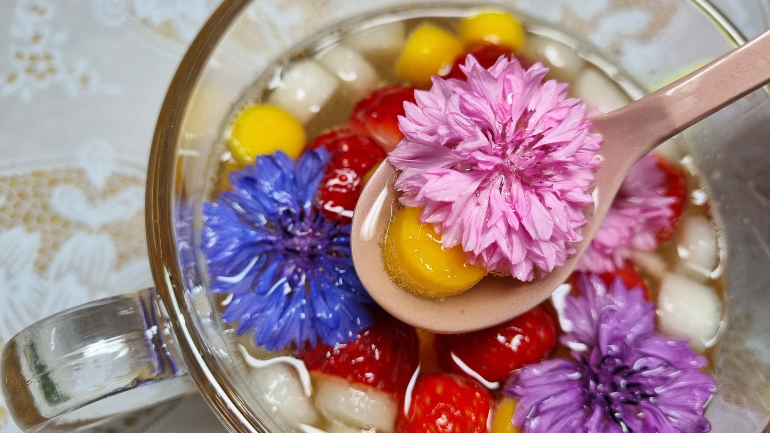 Float the prepared fruits attractively on top of the green plum ade. Finally, if you have edible flowers, place a few on top for a wonderful cafe-like ambiance. This will make the ade look even more vibrant and suitable for special occasions. It tastes even better when served chilled.