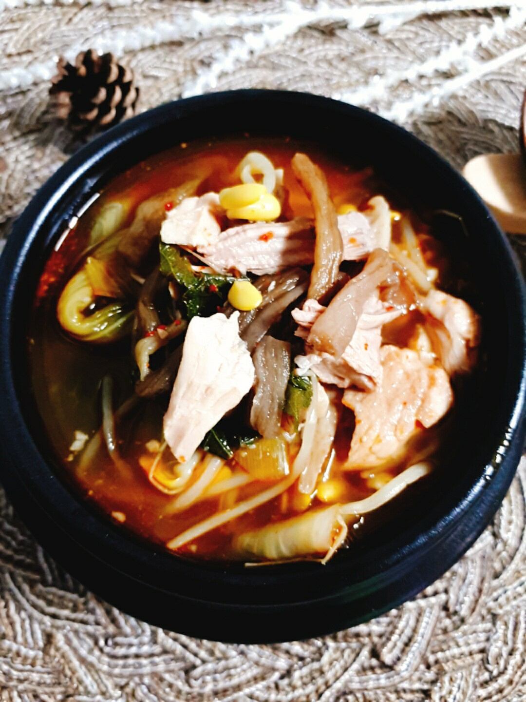 First, wash the bean sprouts thoroughly. Soak the dried king oyster mushrooms in lukewarm water until softened. Cut the cooked taro stems into bite-sized pieces. Select 5-6 boiled pork spine pieces and separate the meat from the bones. I used frozen cooked napa cabbage greens, but you can also blanch fresh napa cabbage lightly before adding. *Tip: Cooked taro stems can be easily found at local markets or the grocery section of large supermarkets.