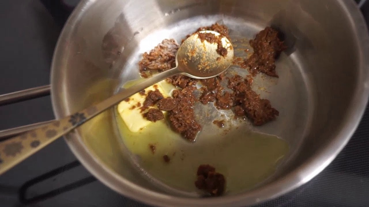In a pot, combine 1 tablespoon of doenjang and 10g of butter over medium-low heat. Stir-fry them until the butter melts and slightly browns at the bottom of the pot. This crucial step is key to reducing any harshness from the soybean paste and infusing it with the nutty richness of the butter, creating a deeper, more complex flavor profile while effectively eliminating any potential gamey notes from homemade doenjang. Stir until the butter is just about to brown, then get ready to add the next ingredients.