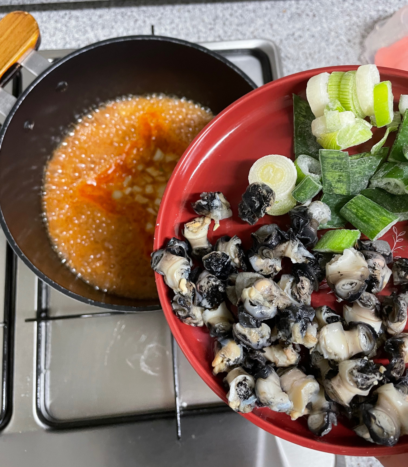 Next, add the chopped scallions and the prepared river snails. To prevent the snails from becoming tough, cook them for only about 30 seconds along with the scallions. This keeps their fresh, slightly chewy texture intact.