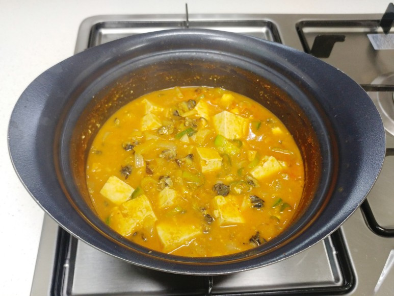 When the ingredients are tender and the sauce has thickened slightly, add the firm tofu, cut into small cubes. Tofu helps to thicken the Gang-Doenjang and adds a soft texture. Simmer for another 2-3 minutes after adding the tofu.