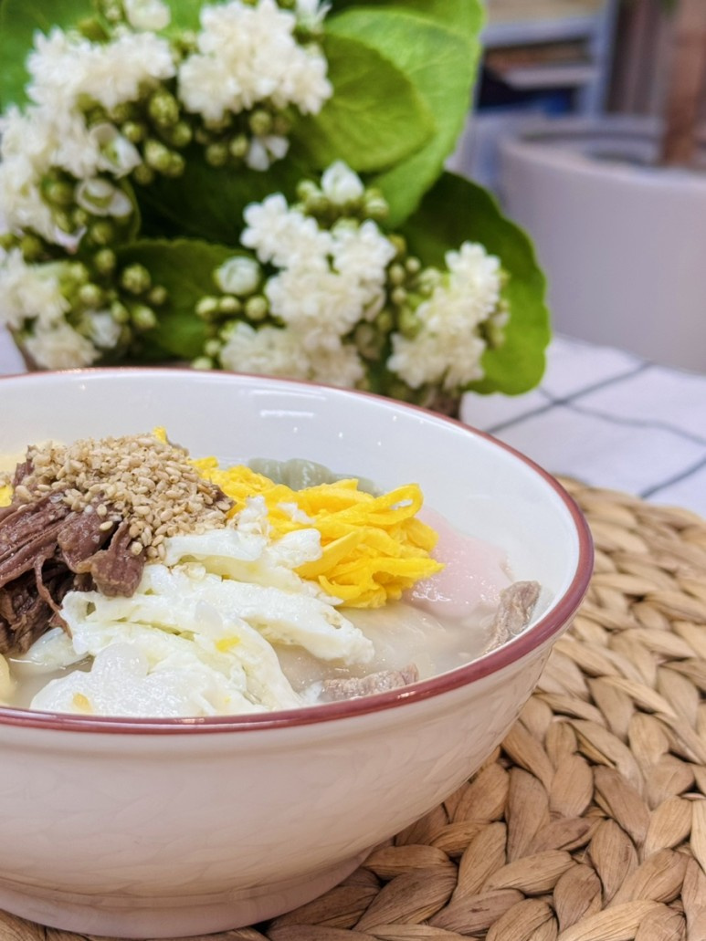 Finally, your delicious New Year’s Tteokguk and Tteokmanduguk are ready! Using cute flower-shaped tteokguk tteok loved by children makes the dish visually appealing. Arrange the prepared beef garnish and egg crepes attractively, and generously sprinkle with a tablespoon of toasted sesame seeds for added nuttiness. Enjoy a hearty and delicious start to your New Year’s morning with this tteokmanduguk, featuring chewy rice cakes, abundant garnishes, and a deep, flavorful broth!