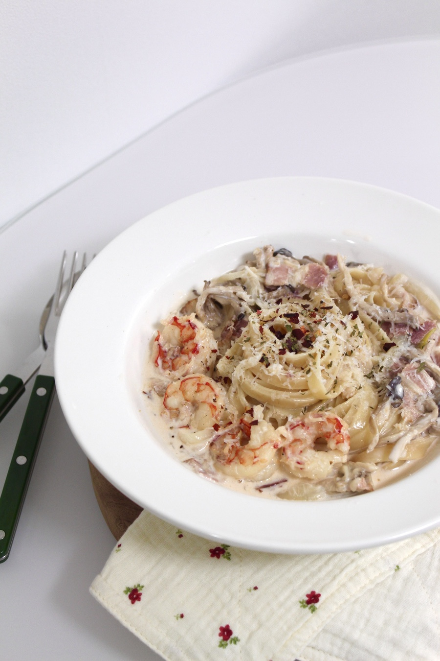 Whenever I buy heavy cream, this is the dish I can’t wait to make: cream pasta! Today, I’ve prepared a shrimp cream pasta that’s packed with bacon, shrimp, and mushrooms for a wonderful texture and flavor. The secret to a great cream pasta is to not use just heavy cream alone, but to mix it with milk in the right proportion. This reduces richness while enhancing the savory aroma for a delightful spaghetti. Keeping this tip in mind will help you make a delicious shrimp and bacon pasta. Let’s get started!