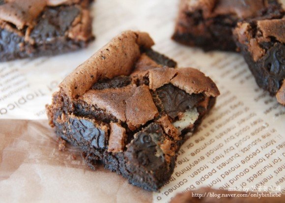 Gently fold in the smaller pieces of chocolate cream cookies. Pour the batter into a prepared baking pan (e.g., an 8-inch square pan) and spread it evenly. Top with the larger cookie pieces. Bake in a preheated oven at 180°C (350°F) for about 15 minutes. A toothpick inserted into the center should come out with moist crumbs attached, indicating a perfectly fudgy texture.