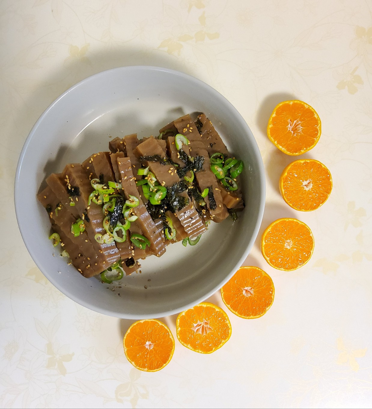 And there you have it – a delicious and nutritious chewy Acorn Jelly Salad! It’s a wonderful side dish that pairs perfectly with a warm bowl of rice, making for a satisfying meal. The combination of fresh green onions, savory sesame oil, and flavorful seaweed creates a universally loved taste. Enjoy your creation!