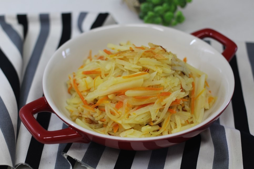 Add the julienned onion and carrot to the pan and stir-fry them with the potatoes. Keep the heat on low. The moisture released from these vegetables will help prevent sticking and their natural sweetness will complement the potatoes.