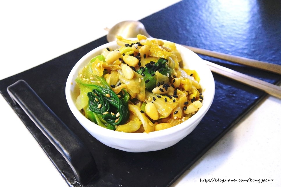 In a large bowl, prepare the savory dressing by mixing together the soy sauce, toasted sesame seeds, sesame oil, and pine nuts. Add the blanched napa cabbage and baby bok choy to the bowl. Gently toss everything together to ensure the vegetables are evenly coated with the delicious seasoning. Be careful not to overmix, to maintain the crispness of the vegetables. If you find the flavor is not quite right, you can add a very small amount of salt to reach your desired taste.