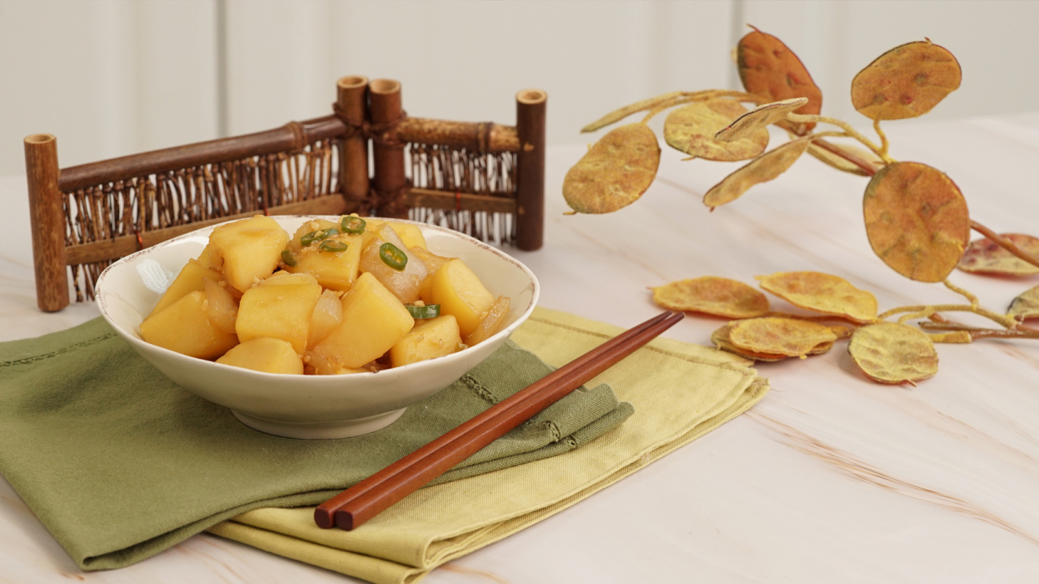Your side dish for today! Sweetly braised onions and potatoes! They’re so soft and fluffy, you’ll gobble up a bowl of rice in no time. Man-made Recipes, Man-made Recipes.