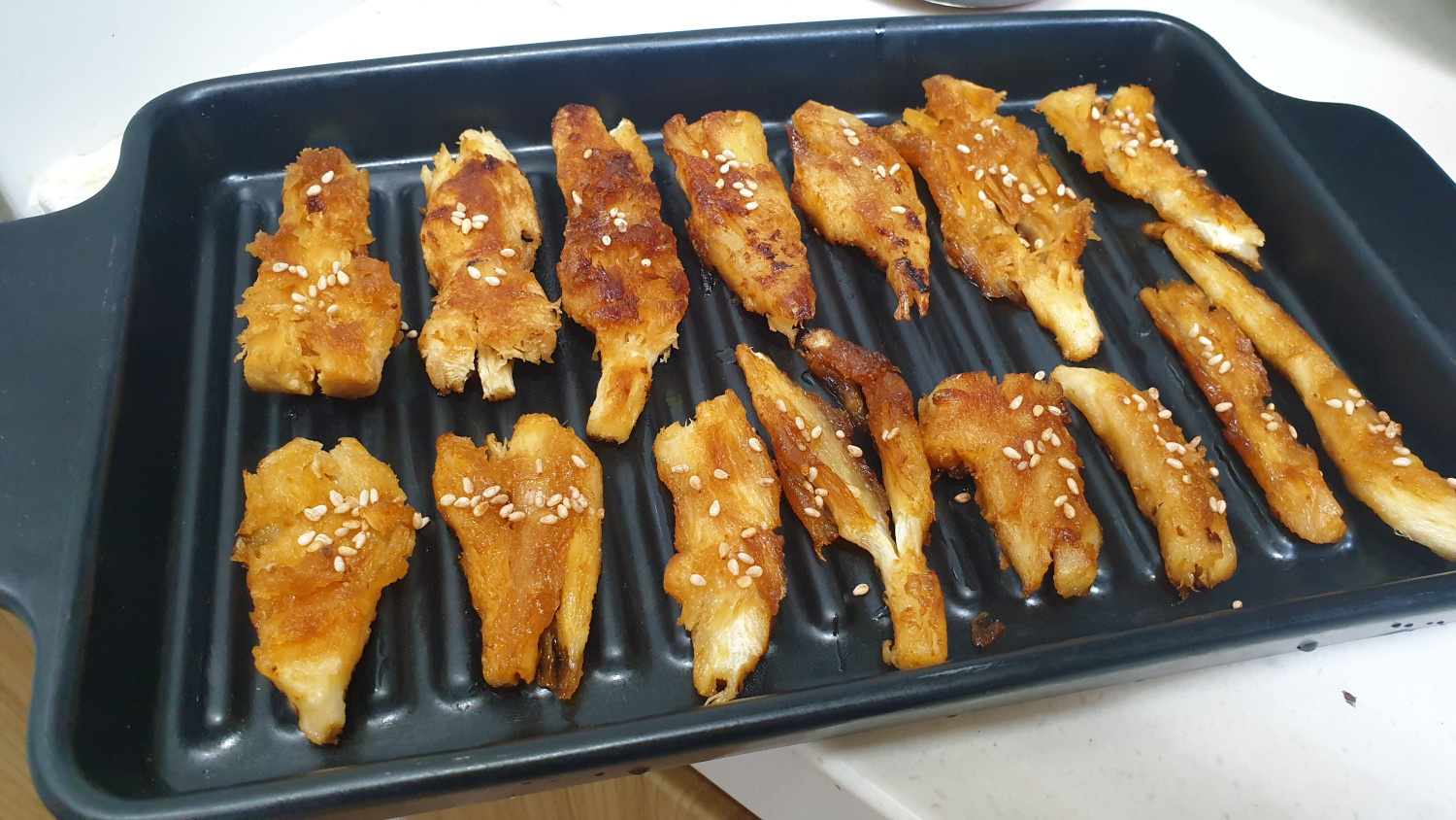 Once one side of the deodeok is golden brown and the sauce has thickened, flip it over and apply more sauce to the other side, cooking until tender and glazed. To serve, arrange the cooked deodeok on a plate and sprinkle with sesame seeds for an extra touch of flavor and visual appeal. Your savory and aromatic Deodeok Jangjorim is now ready to be enjoyed as a delightful side dish!