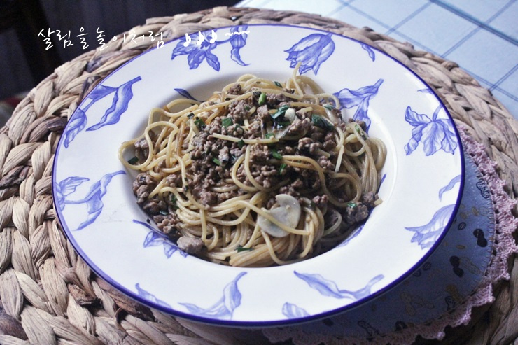 Once the garlic is fragrant and slightly colored, add the pre-cooked pasta to the skillet and toss lightly with the garlic and oil. Next, add the prepared Korean-style pork topping and the garlic chive soy sauce (3 Tbsp). Stir everything together well, ensuring the pasta and pork are thoroughly combined. Finally, plate the pasta attractively. Your delicious Korean-style garlic chive pasta, a harmonious blend of aromatic chives and flavorful pork, is complete! Enjoy your meal!