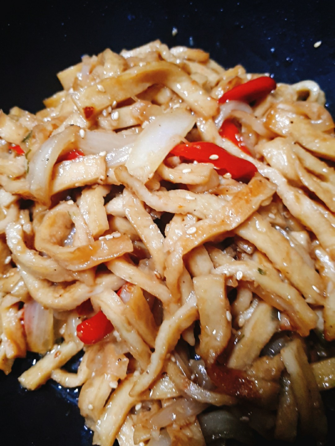 Once all the ingredients are well-stirred and the sauce has coated the fish cakes, turn off the heat. Finally, drizzle with a little sesame oil and sprinkle with sesame seeds for a fragrant finish. Your savory oyster sauce stir-fried flat fish cakes are ready!