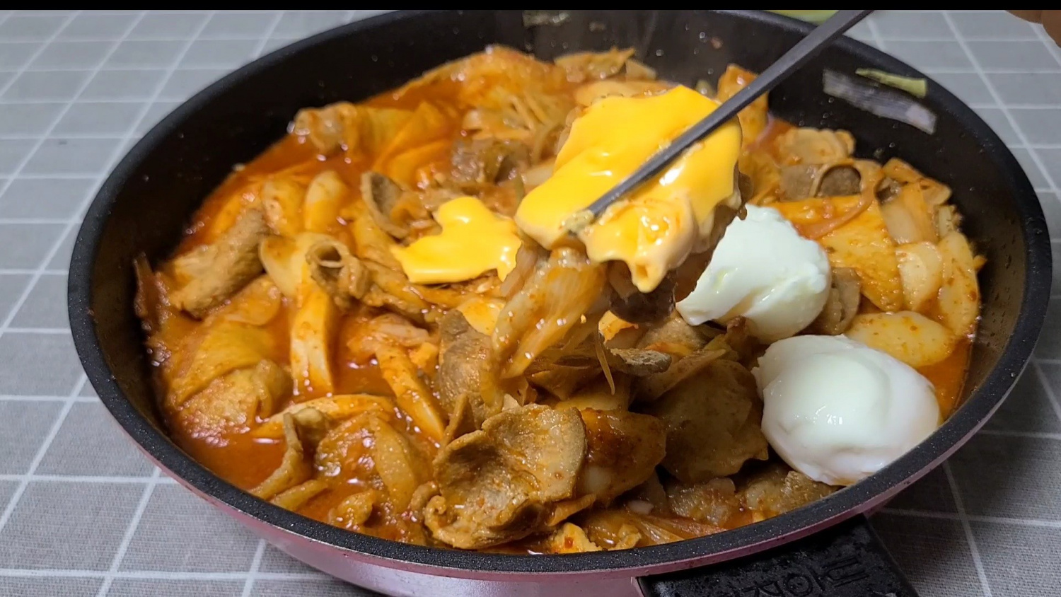 Finally, add the rice cakes and stir them into the sauce. Continue to cook for another 2-3 minutes, or until the rice cakes are soft and the sauce has thickened slightly. Once the tteokbokki is almost ready, you can sprinkle a generous amount of mozzarella cheese on top and cover the pan or let it melt over low heat for an even richer flavor. Serve hot and enjoy your delicious pork belly tteokbokki!