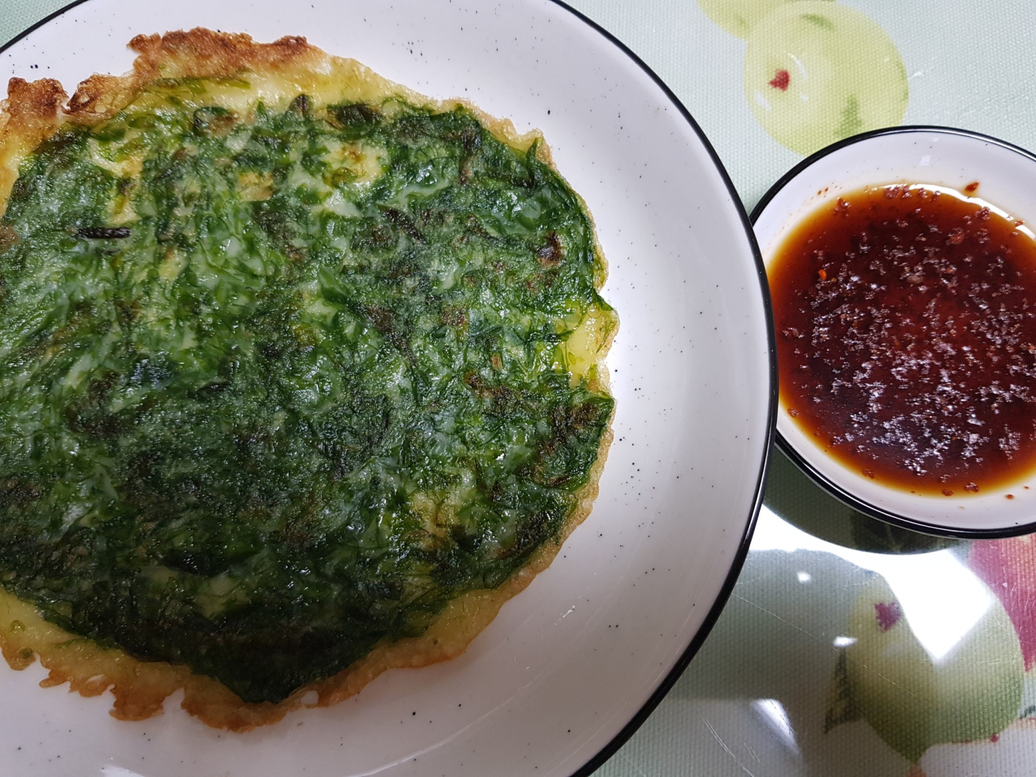In a small bowl, prepare the dipping sauce by mixing 2 tablespoons of soy sauce, a splash of vinegar, and a pinch of red pepper flakes. Serve the hot, freshly made seaweed pancake with the dipping sauce on the side. Dipping a piece into the sauce enhances the aromatic notes of the seaweed and the savory flavors for a truly wonderful experience. Enjoy this simple yet special seaweed pancake!