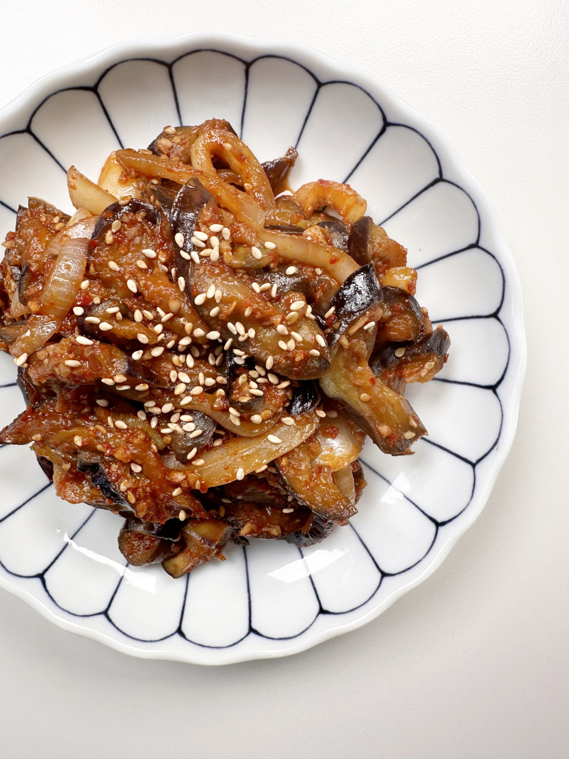Once the eggplant and onion are sufficiently cooked, pour in all of the prepared soy glaze. Stir and toss the eggplant and vegetables gently to ensure the sauce coats everything evenly. Stir-frying over high heat for a short time will help the sauce thicken and cling to the eggplant without becoming watery. Just before turning off the heat, drizzle in 1 tablespoon of sesame oil for a nutty aroma and sprinkle with a pinch of toasted sesame seeds. Give it a quick mix. If needed, you can add a tiny pinch of salt to adjust the seasoning to your liking. Now, enjoy this delightful dish with a bowl of warm rice!