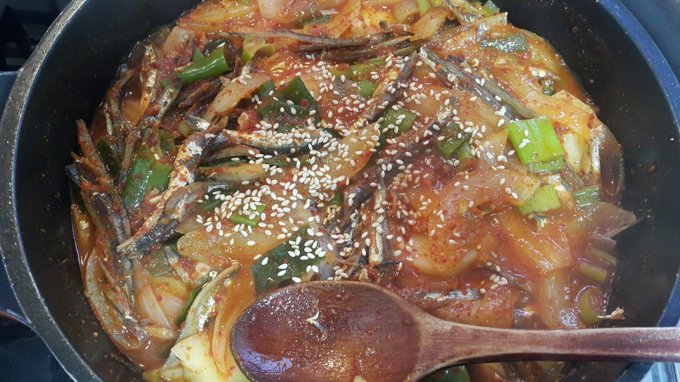 Once the stew begins to boil, remove the lid. Cooking with the lid off allows any fishy smell from the anchovies to dissipate and helps the seasonings meld into the ingredients. Gently stir the contents with a spatula, being careful not to break the potatoes.