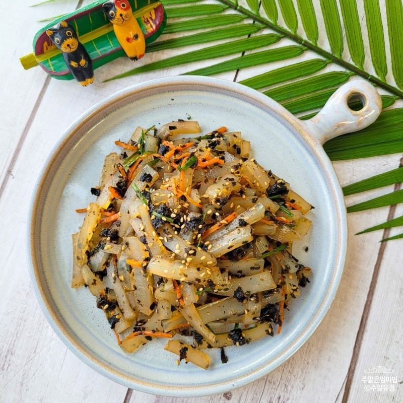 Now it’s time to mix in the seasoning. In a bowl, combine 1 Tbsp sesame oil, 2 Tbsp soy sauce, 1 Tbsp toasted sesame seeds, and 1 Tbsp oligodang. Gently mix everything together with your hands, being careful not to mash the cheongpohuk. The key is to mix gently. Finally, sprinkle generously with seaweed flakes to your liking and mix lightly. Your shiny and delicious cheongpohuk salad is complete! Enjoy your meal 🙂