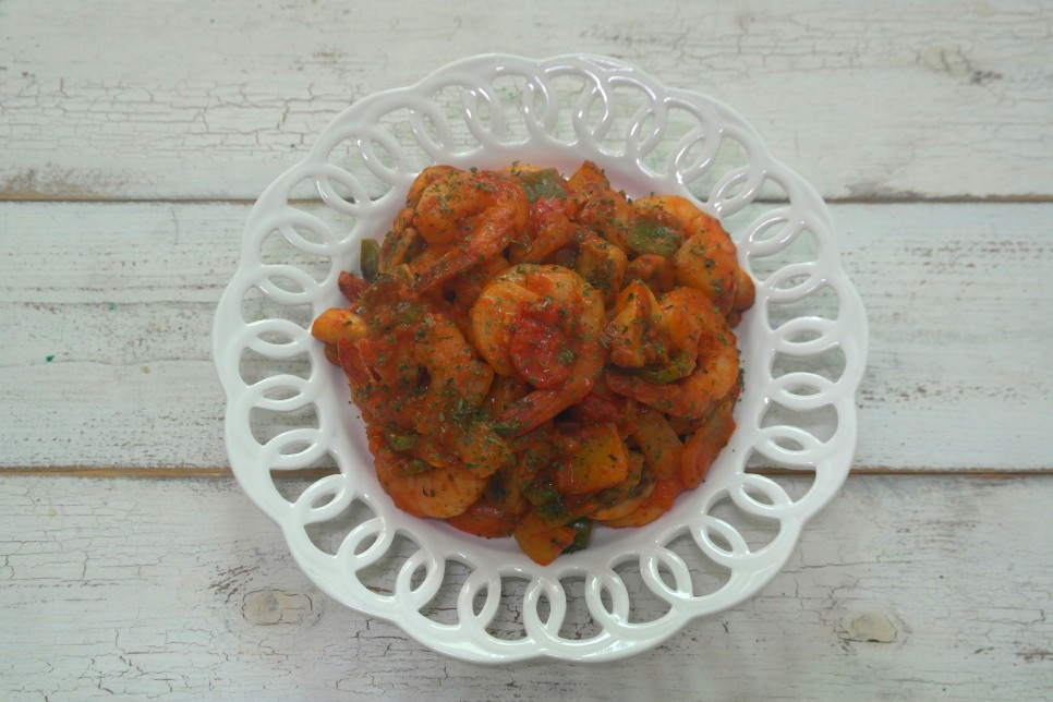 Once everything is well-combined and heated through, sprinkle a pinch of dried parsley over the dish. Your delicious Shrimp Stir-fry with Tomato Sauce is now ready to be served! Enjoy it with rice or crusty bread.