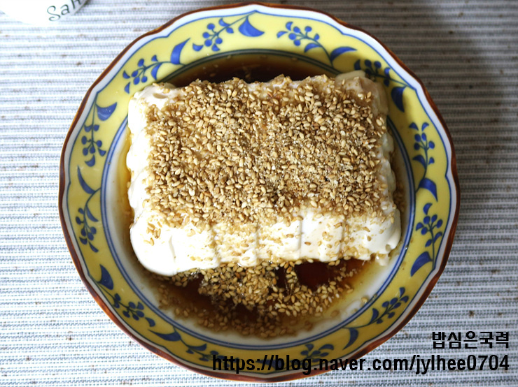 Now, let’s add the delicious dressing! Drizzle 1 tablespoon of sesame oil over the tofu. For an even more aromatic flavor, you can substitute it with 1 tablespoon of perilla oil. Next, add 1 tablespoon of soy sauce. Finally, generously sprinkle the crushed toasted sesame seeds over the tofu, enough that you can barely see the tofu beneath. This adds a wonderful nutty finish!