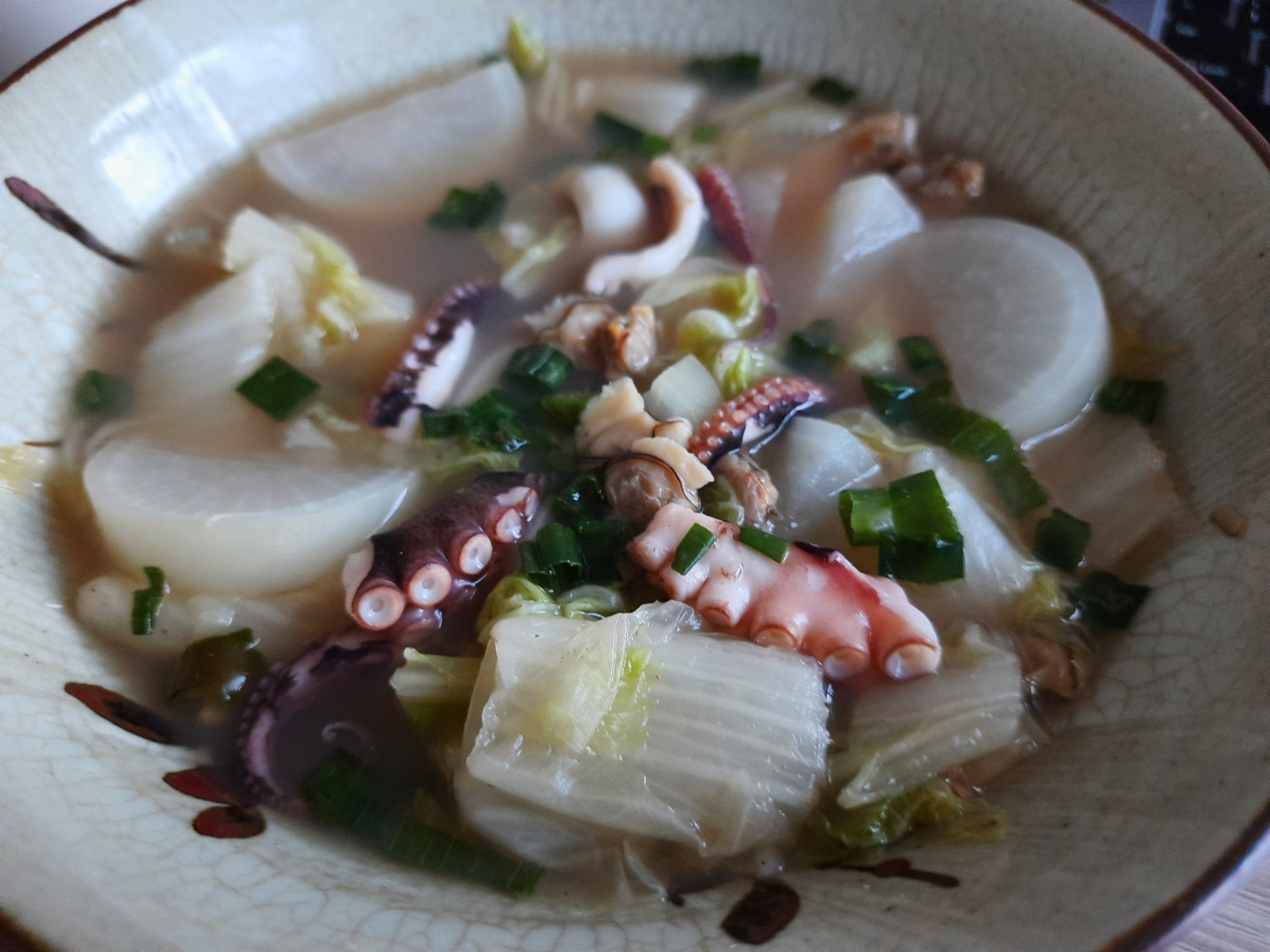 After 9 minutes, your delicious Yeonpotang is ready! Ladle it into bowls and garnish with thinly sliced green onions, if desired, for an even more appealing presentation. Enjoy the warm, refreshing broth and tender octopus. Enjoy your meal!
