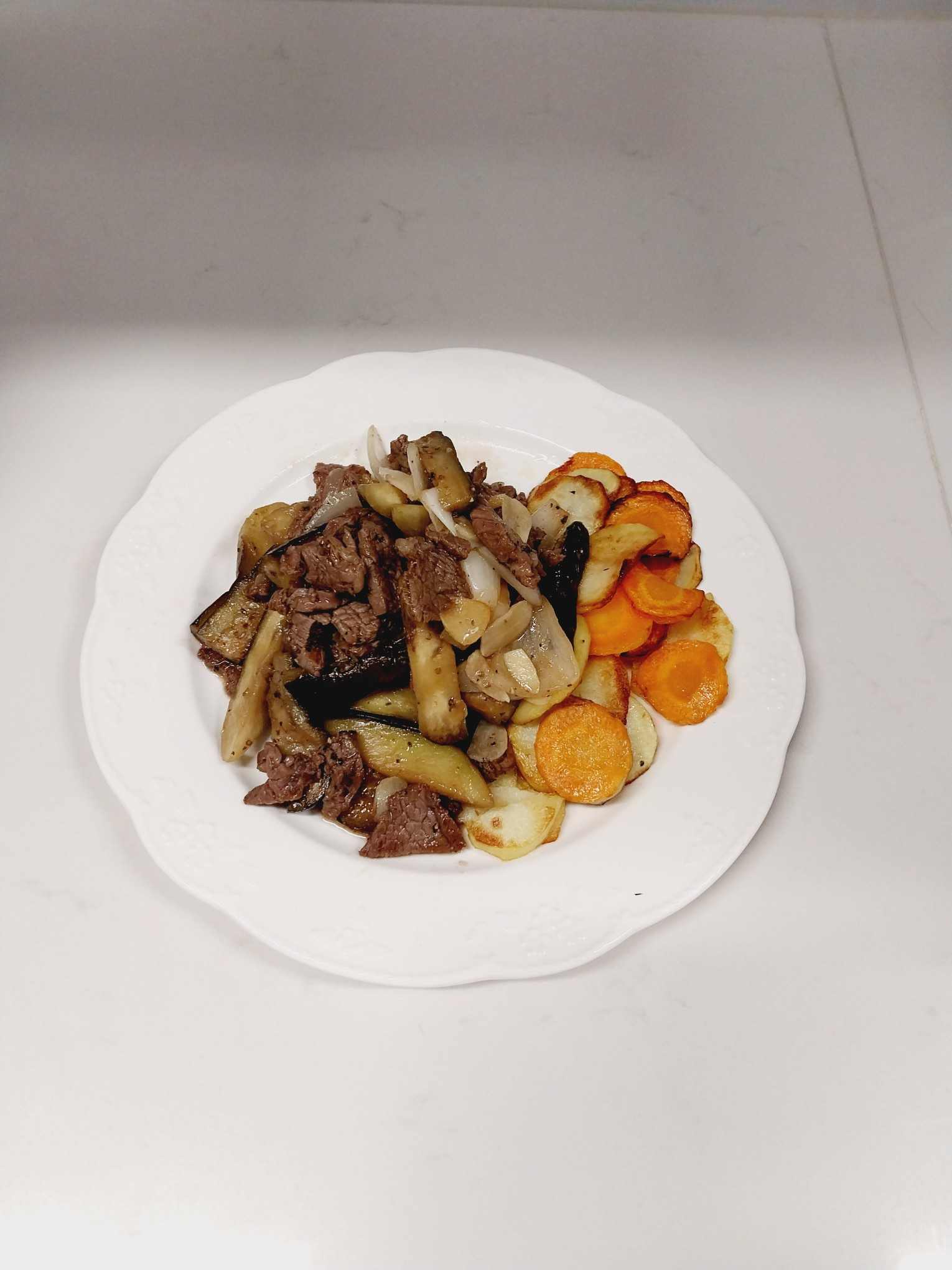 Your delicious stir-fried beef and eggplant is ready! It’s wonderful served with rice, but for a healthier and more complete meal, try serving it with the fried potatoes and carrots, and some fresh lettuce wraps. Enjoy the rich flavors enhanced by a subtle hint of ginger!