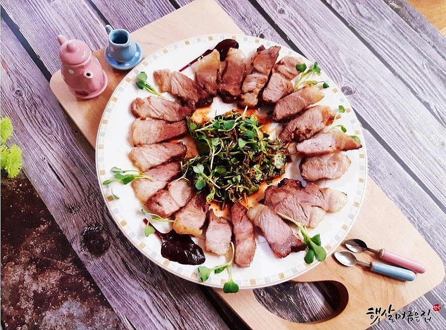 Voilà! You have a perfect whole pork belly BBQ that’s wonderfully crispy on the outside, tender and juicy on the inside. If you prepared side vegetables, toss them with vinegar, sugar, soy sauce, and gochugaru (Korean chili flakes) to create a refreshing, sweet, and savory salad that complements the rich BBQ beautifully.