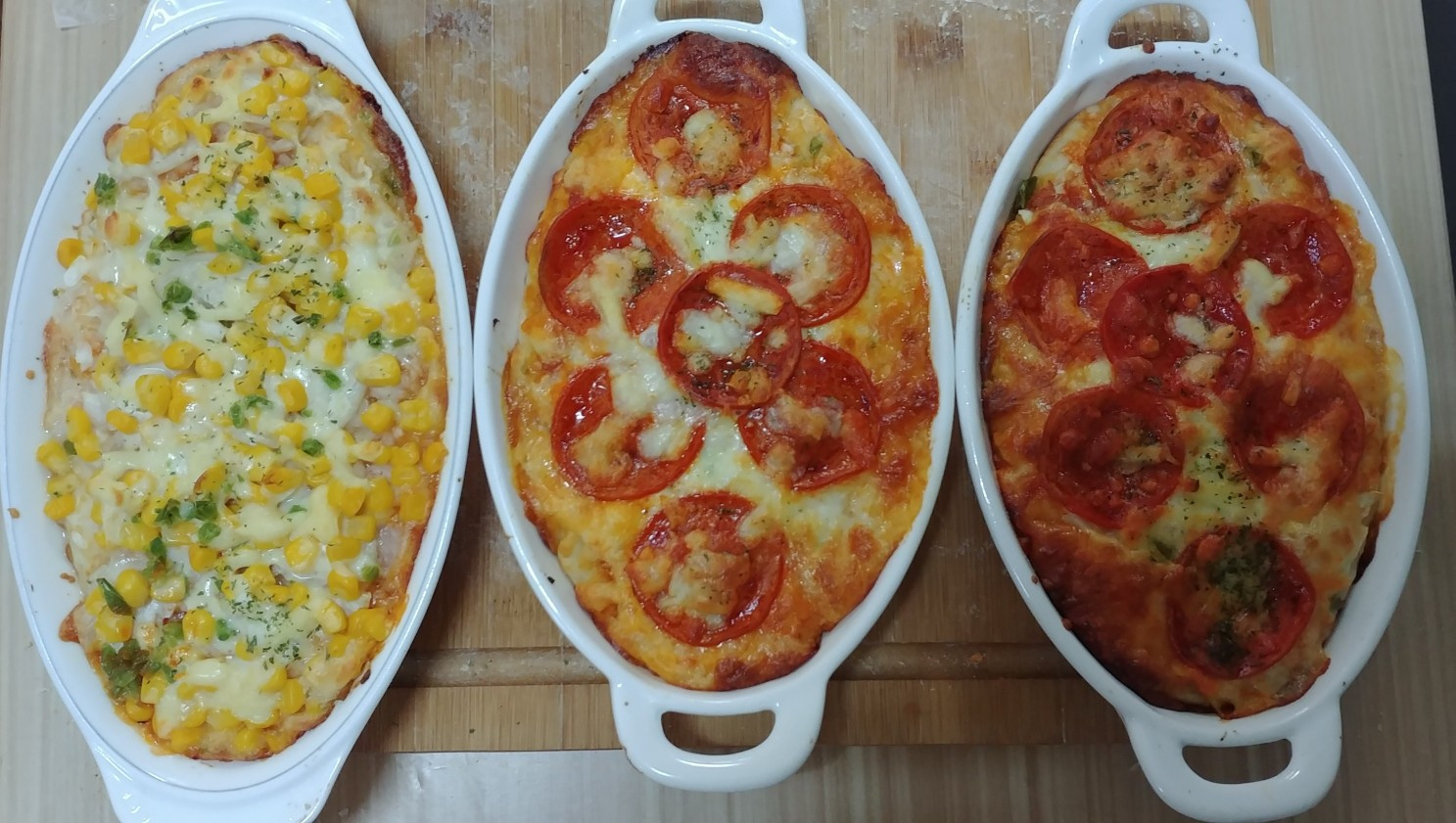 In addition to the basic pizza, we also made a sweet corn pizza by topping generously with corn kernels. Feel free to use various ingredients to create your own unique potato pizza bread!