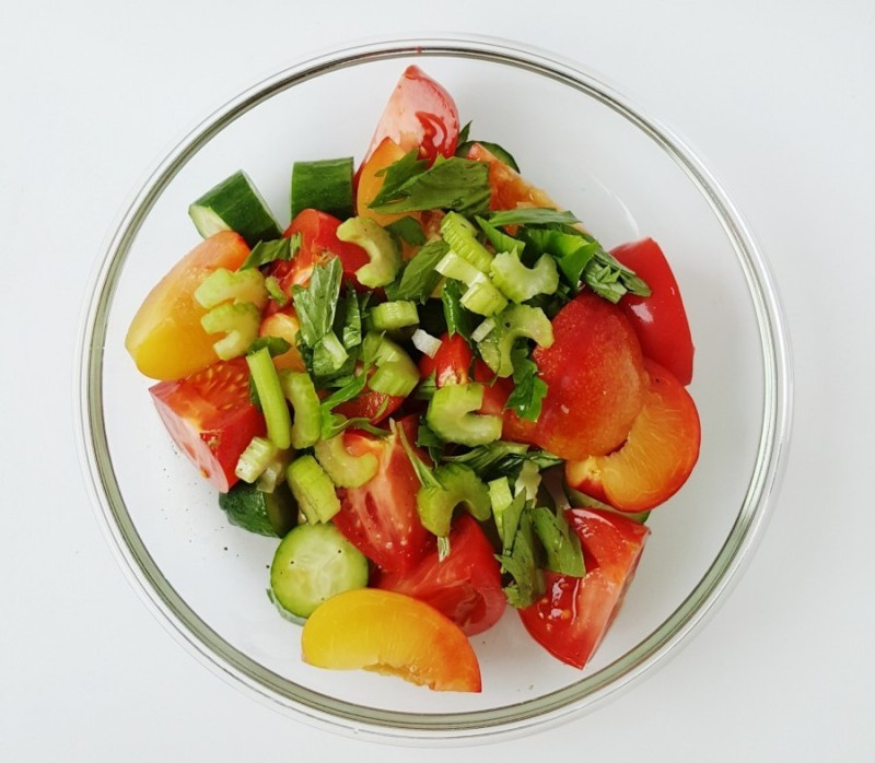 Arrange the sliced cucumbers, plums, tomatoes, and celery attractively in a salad bowl or on plates. Finally, drizzle the prepared refreshing dressing evenly over the salad. Your Sohee-style summer salad, with its crisp texture and invigorating taste, is now complete! Enjoy your meal!