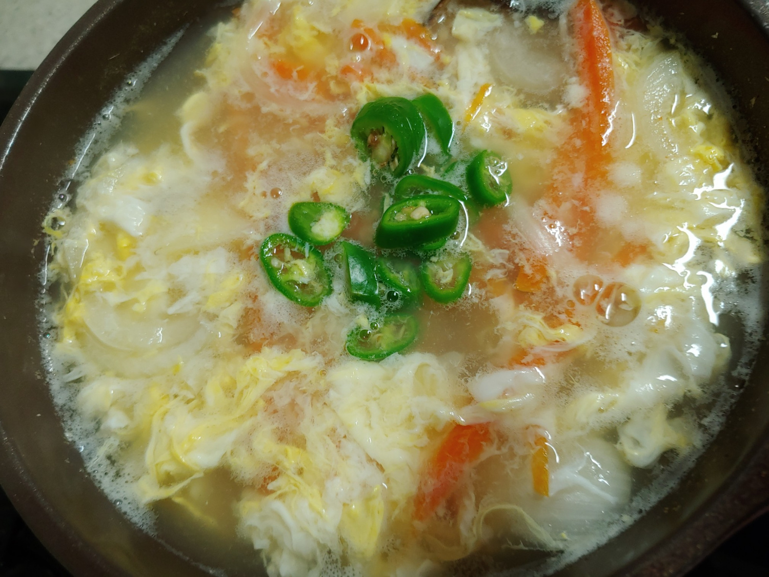 Finally, place the sliced Korean green chili pepper on top of the soup for garnish. Slowly drizzle the whisked egg mixture around the edges of the pot. Cover with a lid and cook for another 1-2 minutes, just until the egg is set. Your spicy and refreshing potato hand-pulled noodle soup is now ready! Enjoy your delicious meal.