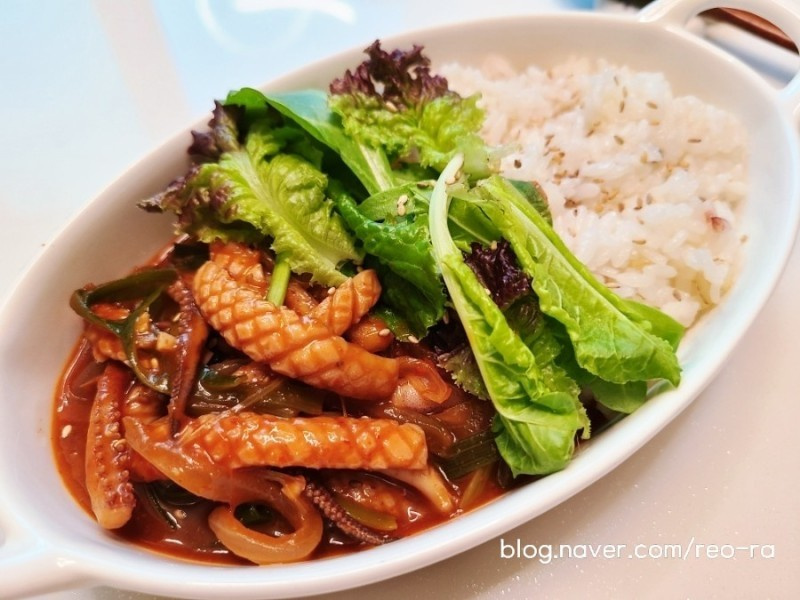 Spoon the generous portion of stir-fried squid mixture over hot cooked rice. Mix it all together with your chopsticks and enjoy! If you like it spicier, consider adding some Cheongyang chili peppers or extra spicy chili flakes while stir-frying. It’s a satisfying and hearty meal that the whole family will love.