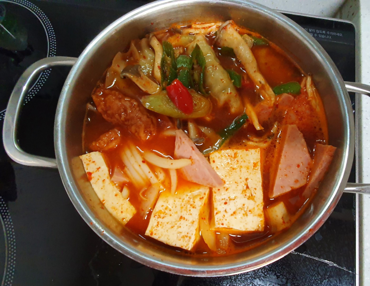 Arrange all the prepared ingredients (ham, tofu, mushrooms, onion, peppers, rice cakes, fish cakes) attractively in a wide and deep pot. Leaving the center open can help the broth infuse better.