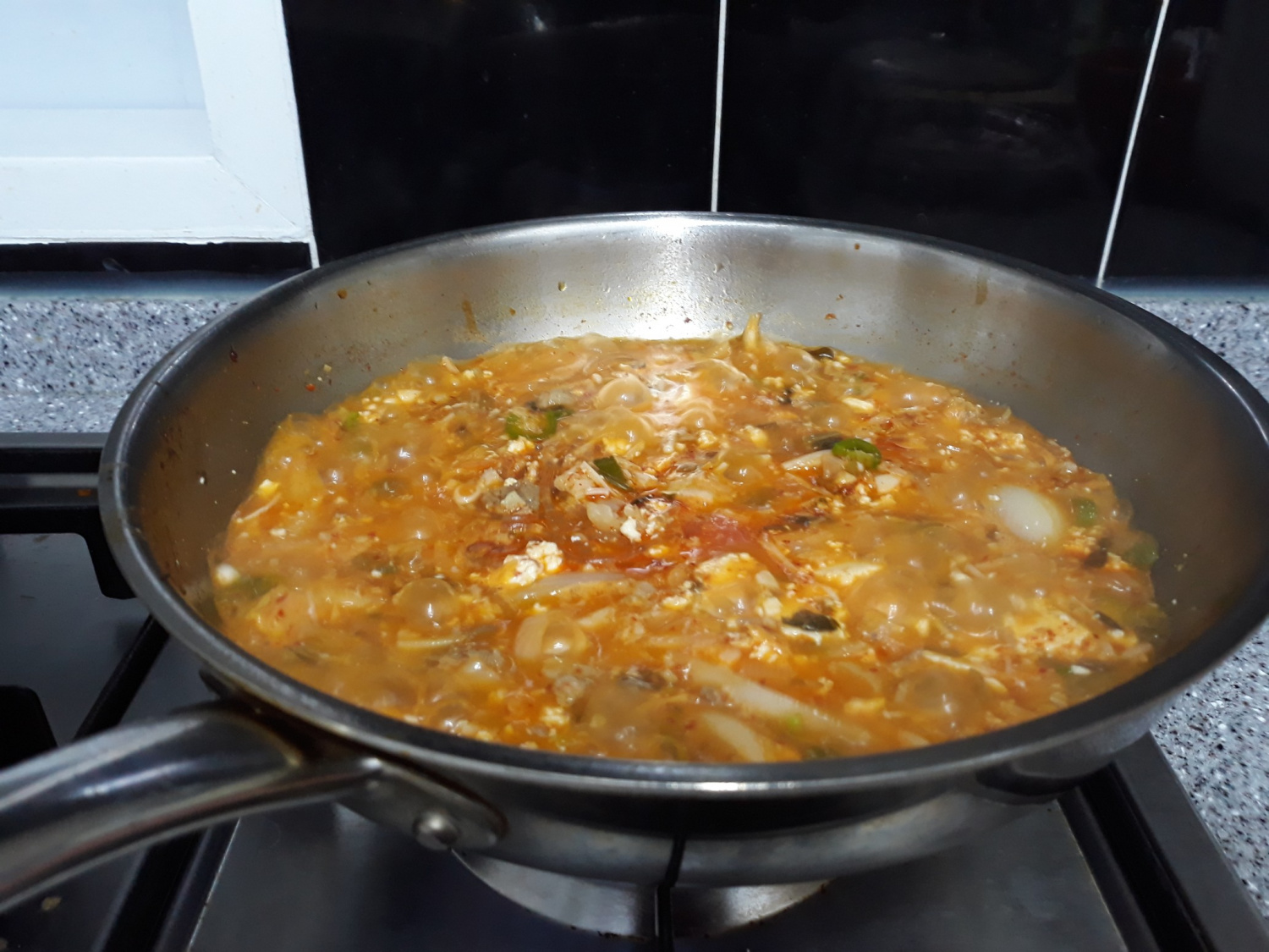 Spicy and Hearty Kimchi Tofu Glass Noodle Stew