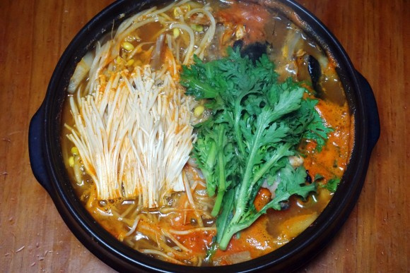 Finally, garnish the stew with fresh crown daisy and enoki mushrooms. These are added at the very end to maintain their texture and flavor. The fragrant crown daisy and slightly chewy enoki mushrooms add a lovely finish. And there you have it – a perfectly spicy and refreshing monkfish stew, ready to be enjoyed! Serve hot and savor every spoonful.