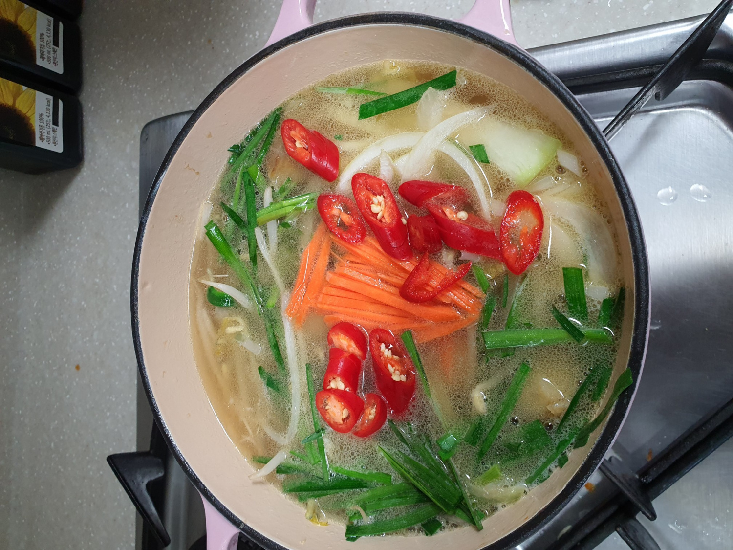 When the vegetables are tender and the broth has a refreshing flavor, gently add the diced tofu and simmer for another short while. Stir carefully to avoid breaking the tofu. Finally, adjust the seasoning with salt. For an extra kick, add the chopped red and green chilies to make a delicious and invigorating pollack soup!