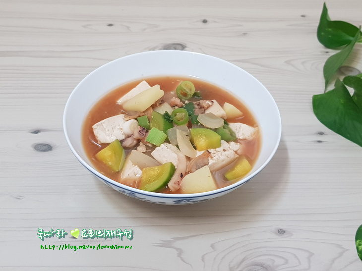 Cut the tofu into 1.5cm thick pieces. Slice the potato and zucchini into half-moon shapes. Thinly slice the onion and diagonally slice the Korean chili peppers. Chop the scallions. Ensure all ingredients are cut into bite-sized, uniform pieces for even cooking.