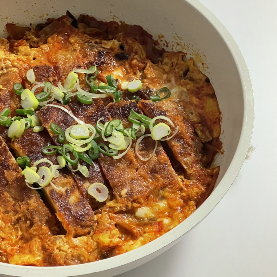Once the broth is boiling vigorously, add all the seasoning ingredients: 1 Tbsp gochugaru, 2 Tbsp sugar, 2 Tbsp fish sauce, and 2 Tbsp kimchi brine. Stir well to combine. We’ve added a generous amount of sugar to balance the sourness of the kimchi, but feel free to adjust it according to your taste and the kimchi’s acidity. Taste and adjust seasoning if needed with soy sauce or salt. Now, arrange the pre-cooked and sliced tonkatsu pieces on top of the broth.
