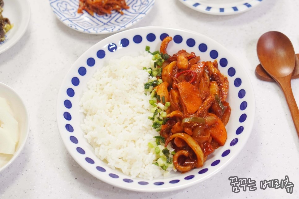 I decided to use two squid that had been in my freezer for quite a while. I considered making fried squid, but the thought of washing all the extra dishes put me off, so I opted for a delicious one-bowl meal: Ojingeo Deopbap (Spicy Stir-fried Squid with Rice). This dish doesn’t require marinating the squid or any special ingredients. As long as you have squid, you can use whatever vegetables you have in your refrigerator to create this flavorful meal. It’s a fantastic way to clear out your fridge!