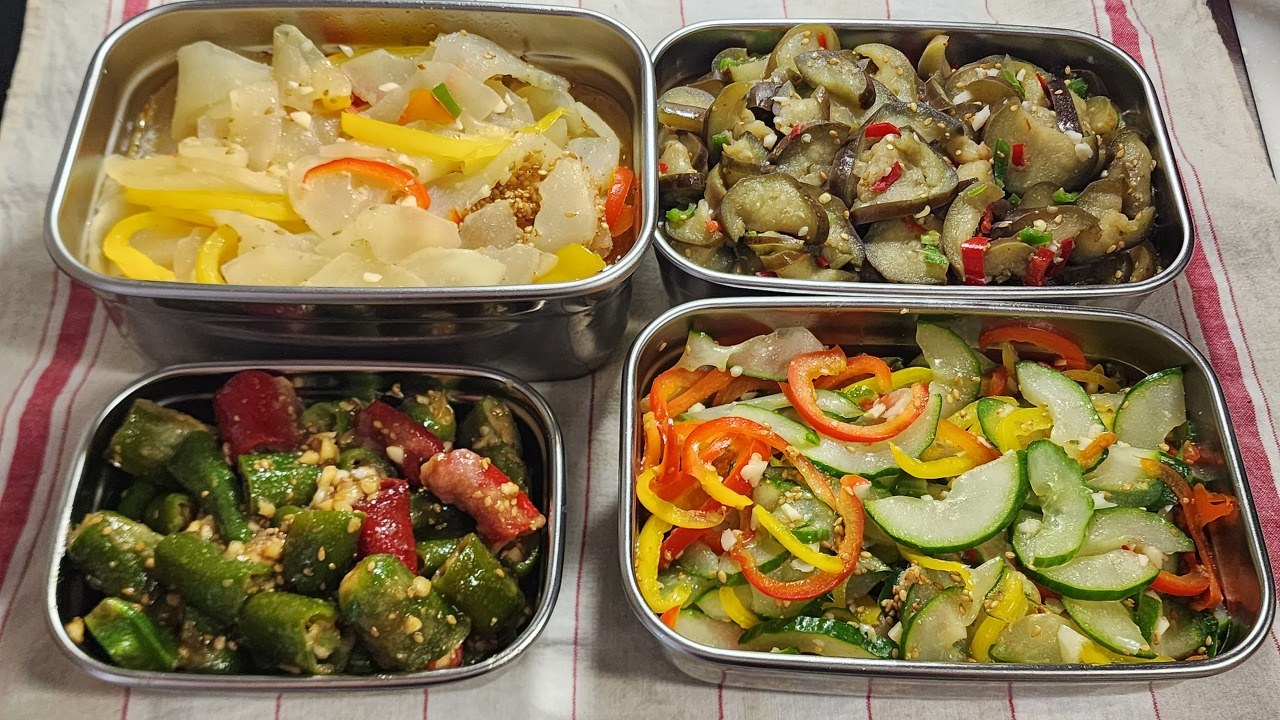 Spicy and Sweet Steamed Peppers with 4 Types of Garden Vegetable Side Dishes