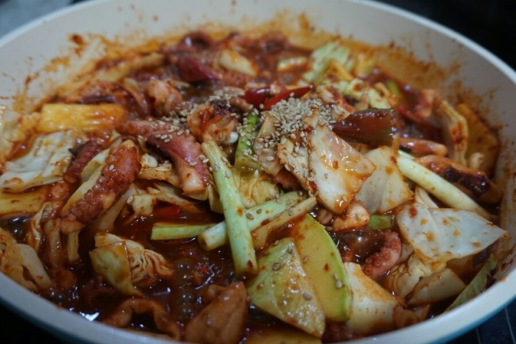 Once the seasoning coats the octopus evenly, add the chopped vegetables and continue to stir-fry over high heat. Cook just until the vegetables are slightly softened, retaining a bit of their crunch. Finally, drizzle with sesame oil and sprinkle with sesame seeds for added aroma. Turn off the heat. You can serve the stir-fry directly from the pan to keep it warm and enjoy it immediately. If you’d like a more substantial meal, consider serving it with boiled noodles to mix in. Enjoy your delicious dinner!